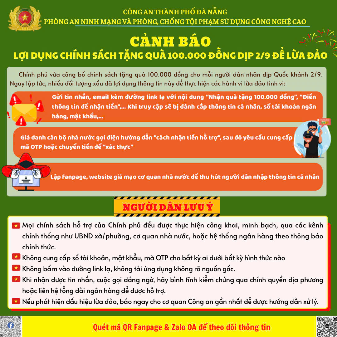Cảnh báo của Công an TP Đà Nẵng về thủ đoạn lừa đảo lợi dụng chính sách tặng quà 100.000 đồng dịp lễ Quốc khánh 2-9