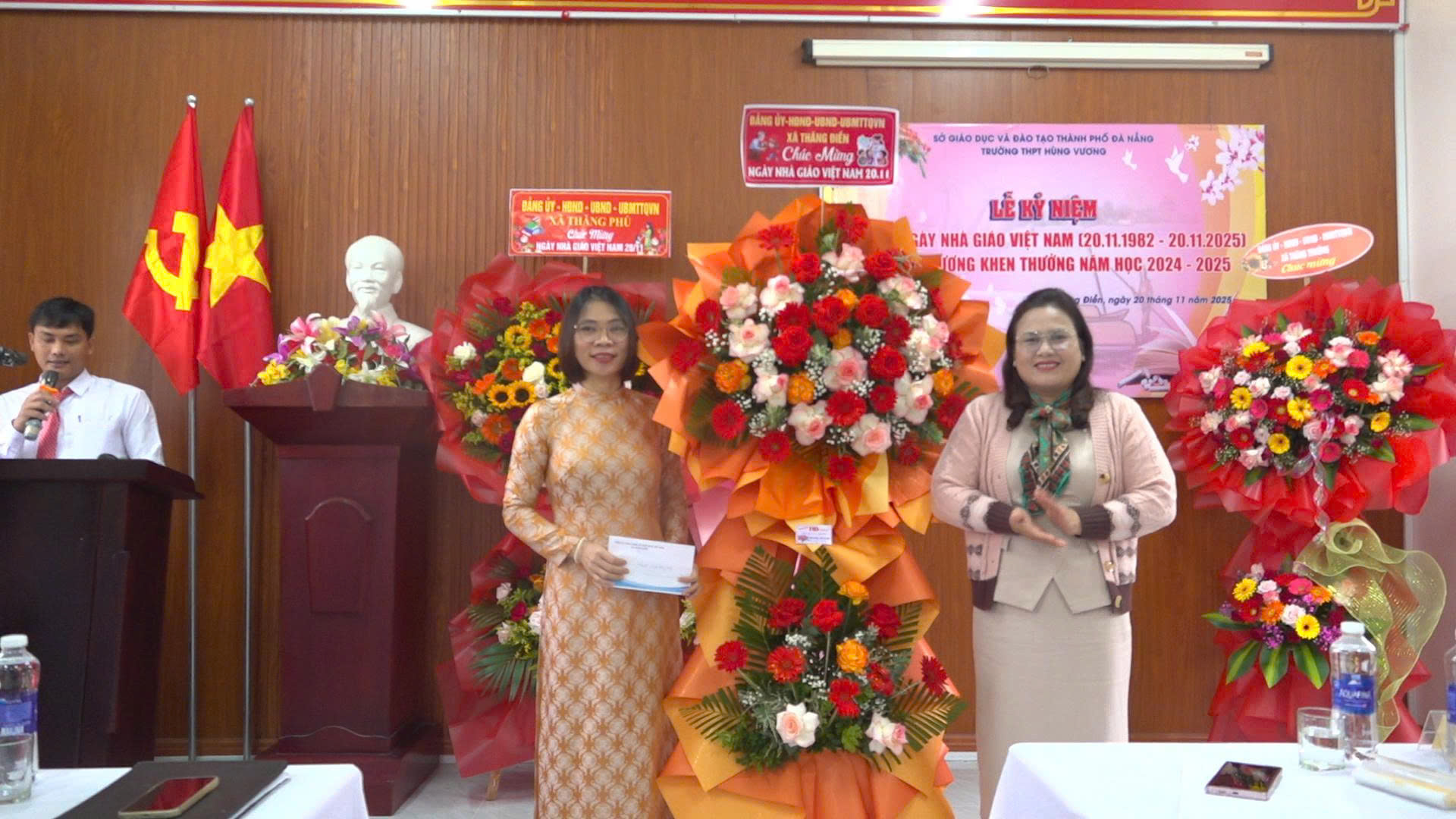 Ảnh: Đ/c Nguyễn Thị Tuyết Thanh, TUV- Bí thư Đảng uỷ xã tặng hoa chúc mứng tại trường THPT Hùng Vương